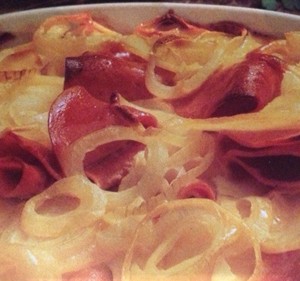 Für den Zwiebel-Wurstauflauf werden 70 dag Erdäpfel gekocht. Erdäpfel schälen, in Scheiben schneiden, salzen, pfeffern. 80 dag große Zwiebel schälen, in Ringe schneiden. 40 dag Schinkenwurst in Scheiben schneiden.