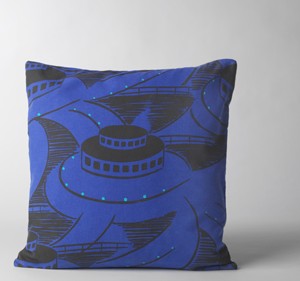 In Orangerot präsentiert sich die „Stadsbiblioteket“, das architektonische Meisterwerk von Gunnar Asplund. Auf dem strahlenden Weiß des Kissens „Globen“ prangt das Innere der Stockholmer Arena, während Fernstraßen in und aus Stockholm führen, vorbei an den Hochhäusern der Johanneshof-Nachbarschaft.