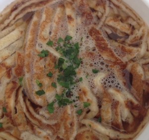 Für die Frittaten brauchen wir 10 dag glattes Mehl, ein Viertel Liter Milch, 1 Ei und etwas Salz. Zutaten zu einem glatten Teig verrühren. In eine Omlettenpfanne nur soviel Butter geben, dass nur die Pfanne befettet ist. Dann den Teig mit einem Schöpfer in die Pfanne gießen und die Pfanne so drehen, dass der Teig auseinanderfließt. Auf beiden Seiten hellbraun backen. Nachher die Frittaten halbieren, einrollen, in dünne Nudeln schneiden, mit Suppe übergießen, mit Schnittlauch oder gehackter Petersilie bestreuen und sofort servieren – fertig.