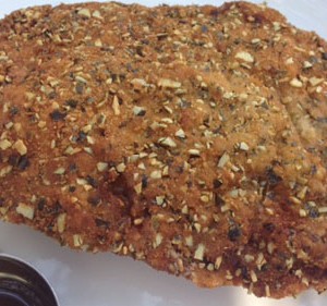 Gefüllte Schnitzel in Kürbiskernpanier mit extra gereichtem Kürbiskernöl servieren.