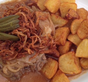 4 Rostbraten salzen, pfeffern, mit scharfen Senf bestreichen, in 1 Esslöffel Mehl wenden und sofort auf beiden Seiten sehr scharf in Öl anbraten. Rostbraten herausnehmen und in eine vorgewärmte Kasserolle geben. Fond in der Pfanne mit Rindsuppe aufgießen, auflösen, aufkochen lassen und aufgelösten Fond zu dem Rostbraten in die Kasserolle leeren. Ein Drittel der Zwiebel dazugeben und Fleisch auf kleiner Stufe weich dünsten.