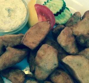 Dazu gibt es Salat nach Angebot und Sauce tartare – guten Appetit!
