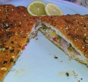 Schnitzel auflegen, eine Hälfte mit einer schönen großen Scheibe Emmentaler, einer großen Scheibe Schinken, gedünsteten Zwiebel und geschnittenem Paprika belegen. Schnitzel zusammenklappen und die Ränder gut zusammendrücken.