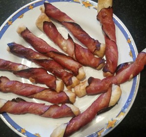 Für die Speckstangerl wird eine Packung Blätterteig nach Anleitung ausgerollt und in dünnere Streifen geschnitten. Teigstreifen mit verschlagenem Ei bestreichen, mit dünn geschnittenem Selchspeck umwickeln, auf ein Backblech legen und schön knusprig backen – fertig – guten Appetit!