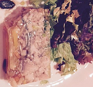 Eine gut gefettete Kastenform mit den geschnittenen Eiern, Cornichons und eventuell Kapern auslegen, geschnittenes Fleisch darauf verteilen und heiße Aspiksuppe darüber gießen. Abkühlen lassen und dann im Kühlschrank für mindestens 12 Stunden kaltstellen – fertig.