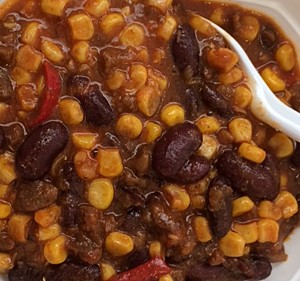 Zwiebel und Knoblauch in etwas Öl anrösten, Wadschinken und 50 dag Faschiertes hinzufügen, und weiter rösten. Mit einem Spritzer Essig ablöschen. Passierte Paradeiser, 2 Teelöffel Paprikapulver, 1 Teelöffel Oregano, etwas Kreuzkümmel und Koriander dazu geben und Sauce etwas einkochen lassen. Mit etwas Gemüsesuppe aufgießen, mit Chiliflocken, Salz, Pfeffer und Paradeismark abschmecken; Fleisch bei schwacher Hitze weichdünsten. Gekochte Bohnen, geschnittenen Paprika und Kukuruz dazugeben, circa 10 bis 15 Minuten weiter köcheln lassen – fertig.