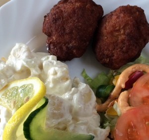Fleischlaibchen nach Art des Hauses mit Mayonnaise-Erdäpfelsalat oder Salat nach Saison servieren – guten Appetit!