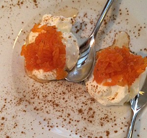 2 Pfirsichkompott-Hälften fein hacken, mit Orangenlikör parfümieren.