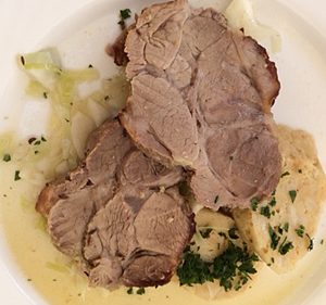 Jungschweinsbraten auf warmen Krautsalat anrichten und mit Semmelknödel oder gekochten Erdäpfel servieren – guten Appetit!