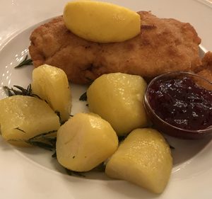 Hühner-Corden bleu mit Karotten-/Schinkenfülle mit Petersilerdäpfel und Salat nach Saison servieren – guten Appetit!