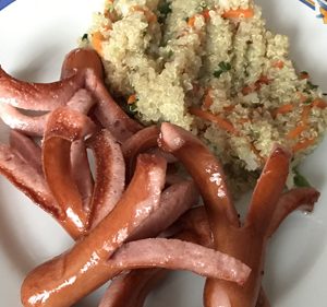 Quinoa mit Gemüse und Grill-Würstel servieren – guten Appetit!