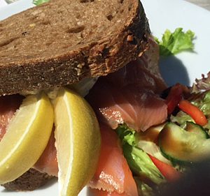 Kräuter-Lachsfilets in dünne Scheiben schneiden, mit gemischten Salat, Bauernbrot und eventuell Butter servieren – guten Appetit!