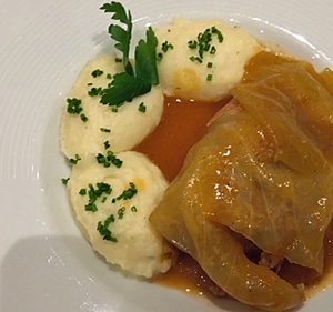 Sauerkraut-Rouladen mit Paprikasauce und Erdäpfelpüree servieren – guten Appetit!