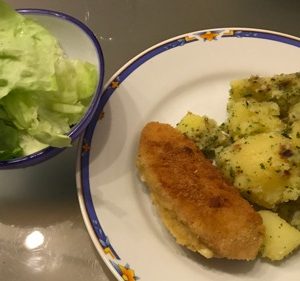 Hühnerbrüste in Haselnuss-Panade mit Petersilerdäpfel und Salat servieren – guten Appetit!