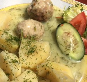 Klopsy in Dillsauce mit gekochten Erdäpfel anrichten, vor dem Servieren noch mit fein gehackter Dille bestreuen – guten Appetit!