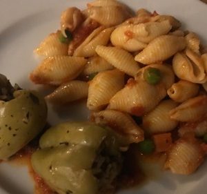 Mit Schafkäse gefüllte Paprika mit Sugo und Muschelnudeln servieren – guten Appetit!
