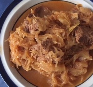 Fertige Paradeissauce und 1/2 kg Sauerkraut hinzufügen, gut durchrühren und alles auf kleiner Hitze langsam weich dünsten – fertig.