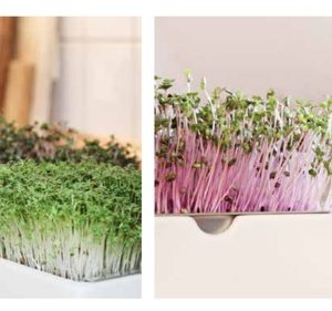 Mit dazu gehört ein Edelstahleinsatz und zwei, nach DE-ÖKO-070 biozertifizierte Saatpads der Sorten Rucola und Gartenkresse.