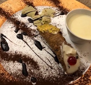 Sizilianische Waffelröllchen mit Mascarpone-Creme füllen, mit Kakao und gehackten Pistazien bestreuen und mit Vanillecreme servieren – guten Appetit!