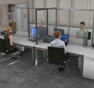 Laut Hersteller handelt es sich um mobile Elemente aus Plexiglas, die in verschiedenen Größen und Ausführungen situationsabhängig eingesetzt werden können. Die Produktpalette reicht, so STANDout weiter, vom einfachen Aufsteller auf Schreibtischen über mehrteilige aluminiumgerahmte Konstruktionen für Multideskplätze oder Rezeptionspulte bis hin zu raumhohen, nur auf der Zugangsseite offenen Schutzkabinen sowie mobilen Trennwänden für Großraumbüros.