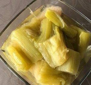 Rhabarber mit Wasser bedecken, mit 2 Packungen Vanillezucker, 1 Zimtstange, 3 Gewürznelken und Zucker nach Geschmack würzen, das Ganze zum Kochen bringen und kurz auf kleiner Flamme vorsichtig kochen, bis der Rhabarber gar ist. Zimtstange und Gewürznelken entfernen – fertig.