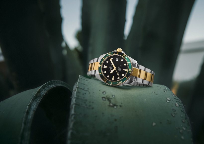 Komplementiert wird die Taucheruhr durch ein Bicolor-Edelstahlarmband mit goldfarbenen PVD-Gliedern und einer Schließe mit Tauchverlängerung.
