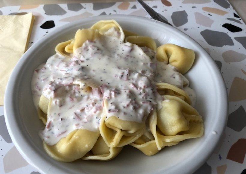 Tortelloni mit Champignonfülle mit Schinken-Rahm-Sauce übergießen, mit Parmesan bestreuen und mit Salat nach Saison servieren – guten Appetit!