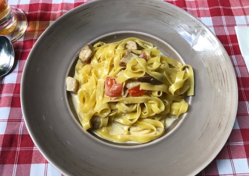 Tagliatelle, diese breiten Bandnudeln, passen ja hervorragend zu sämigen Saucen. Wie wäre es mit Tagliatelle, die ganz ohne Fleisch auskommen und stattdessen mit geräucherten Tofu zubereitet werden.
