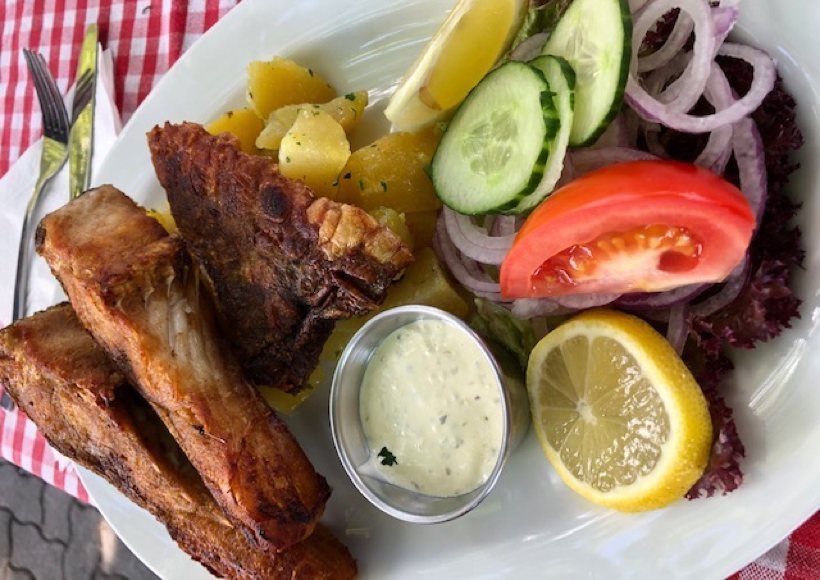 Gegrillten Karpfen mit Sauce tartare, Petersilerdäpfeln und viel Salat nach Gusto servieren – guten Appetit!