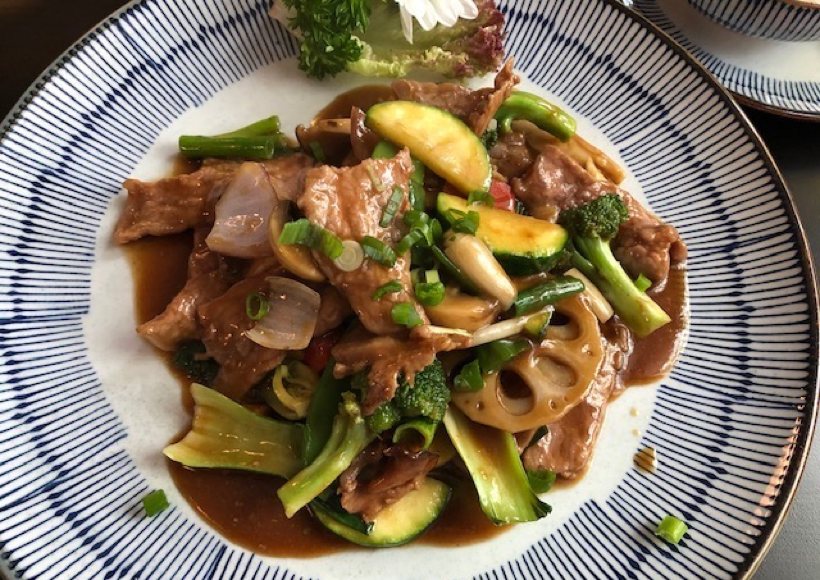 Rindfleisch mit Lotus und Gemüse mit Reis servieren – guten Appetit!