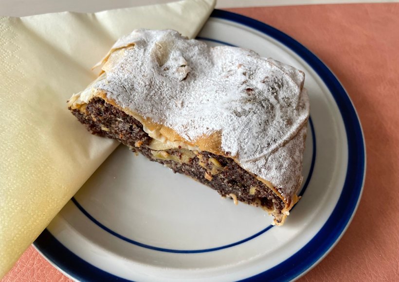 Vor dem Servieren den Mohn-Apfel-Strudel mit Staubzucker bestreuen – guten Appetit!
