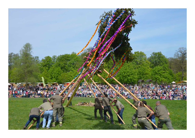 Ganz der Tradition verpflichtet, wird ein Maibaum aufgestellt, dazu erklingt Musik nicht aus der Dose, sondern live.