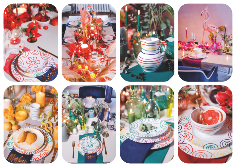 Farbenfroh und besonders strahlend kommt die Kollektion „Regenbogen“ daher. Dank ihrer vielfältigen Farben kann jeder Tisch ganz nach Anlass gedeckt werden. Ob dezent, mit einfärbigem Dekor oder kunterbunt, Fröhlichkeit versprühend, der Kreativität sind fast keine Grenzen gesetzt.