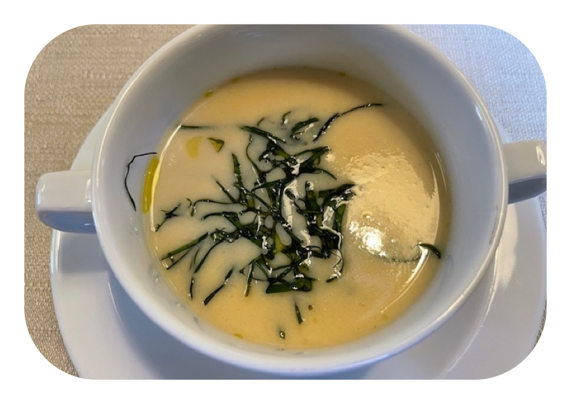 Süßkartoffel-Kohlrabicremesuppe mit frittiertem Kohlrabi-Blattgrün servieren – guten Appetit!