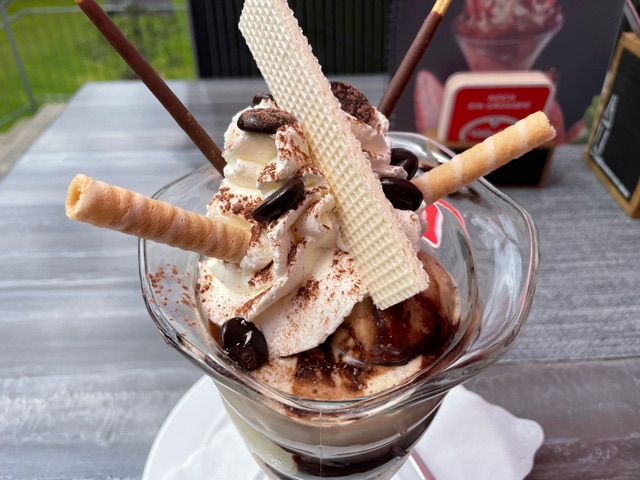 Kaffee-Nougat-Eisbecher mit Waffeln, Hohlhippen oder/und in Schokolade getunkte Stangerln servieren – guten Appetit!