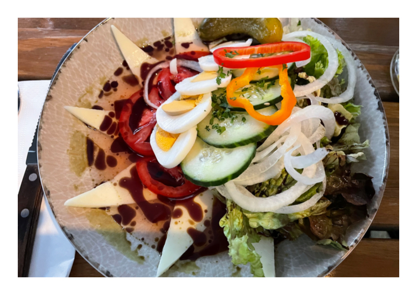 Schafkäse auflegen, Paradeiser, Blattsalat, Zwiebelringe, Gurkenscheiben und Paprika darauf schichten, alles mit Apfelessig marinieren, mit Kernöl beträufeln und Ei und Essiggurkerl hinzufügen – fertig
