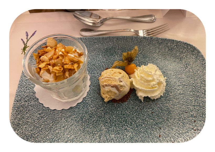 Mandelkrokant und getrocknete Apfelscheibchen als Abschluss darauf streuen – fertig.