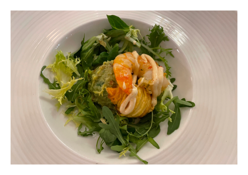 Blattsalat auf einen Teller aufteilen, Guacamole mittig platzieren, Hühnerbrust und Garnelen darauf legen und mit Chilimayonaisse garniert servieren – guten Appetit!