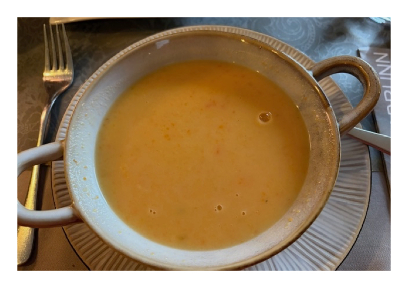 Diesmal haben wir dies mit einer Kokos-Karotten-Orangencremesuppe probiert und siehe da, es hat wenigstens ein bisschen genutzt.