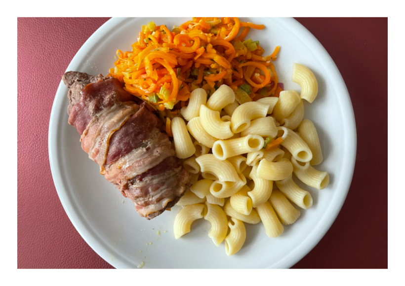 Rindsrouladen mit Krenfülle mit beliebigen Teigwaren und Julienne-Gemüse servieren – guten Appetit!