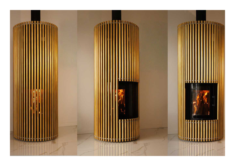 Die verwendete Messinglegierung, die mit einem hohen Kupferanteil aufwartet, intensiviert mit ihrem warmen Glanz noch die Wärme, die von der Feuerstelle abgestrahlt wird.
