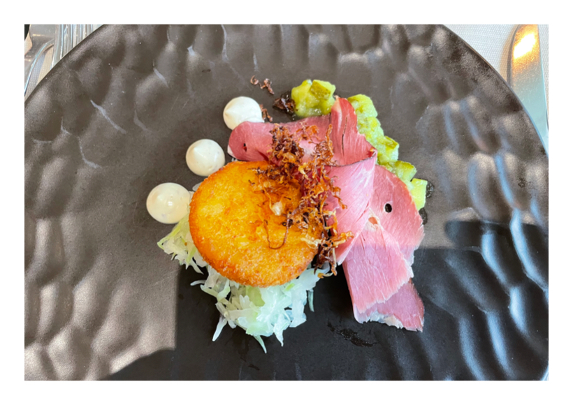 Sauerkraut, Gurkenrelish, Rösti auf einen Teller geben, Pastrami darauf legen und mit Pommery Senfsauce garniert servieren – guten Appetit!