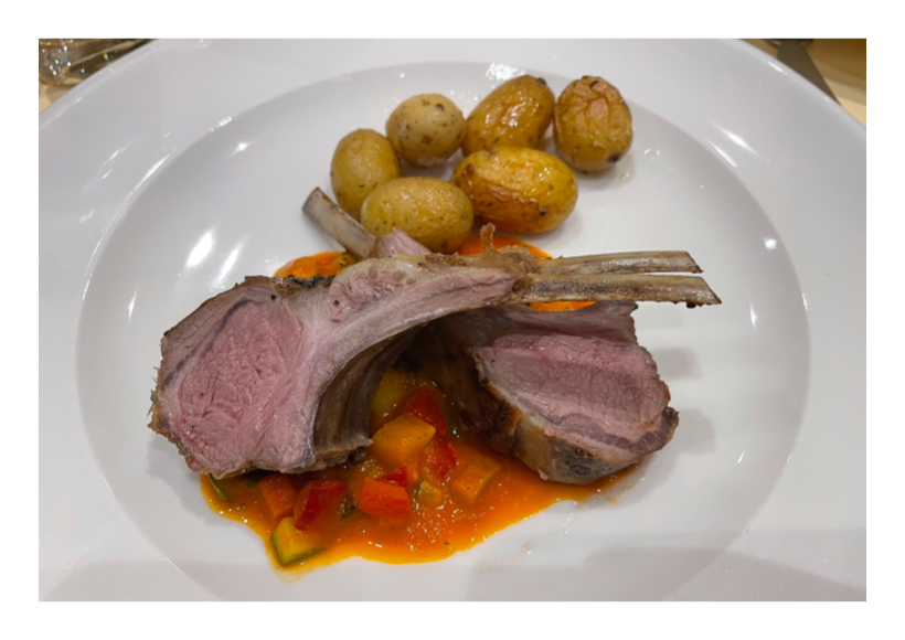 Lammkrone auf mediterranem Gemüse platzieren und mit Rosmarinerdäpfeln servieren – guten Appetit!