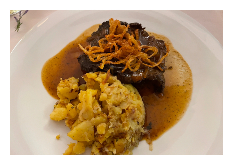 Diesmal kommt das Rib Eye gedünstet daher, dazu wird Erdäpfelschmarrn und viel Salat serviert und für noch mehr Geschmack sorgen dann gebratene Zwiebelringe.